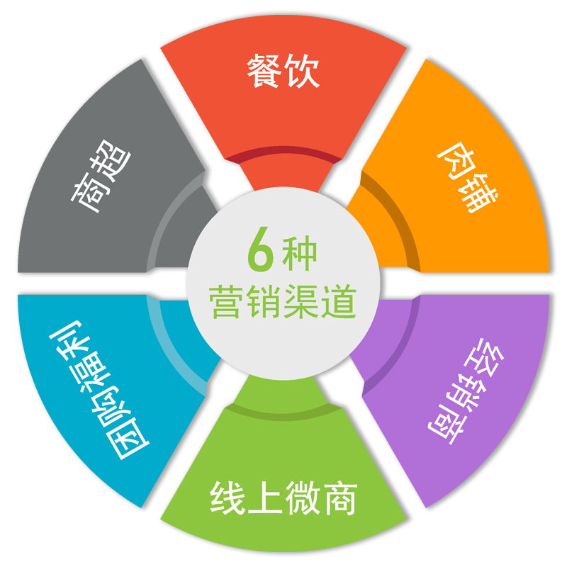 公司产品的营销渠道主要有商超、餐饮、肉铺、团购福利、线上微商、经销商6大块,目前合作的主要客户有德国麦德龙超市、日本平和堂超市、钱大妈、费大厨、班厨等,自营及加盟的花猪肉铺有10余家,市场营销结构多样化,产品深受广大群众的喜爱。