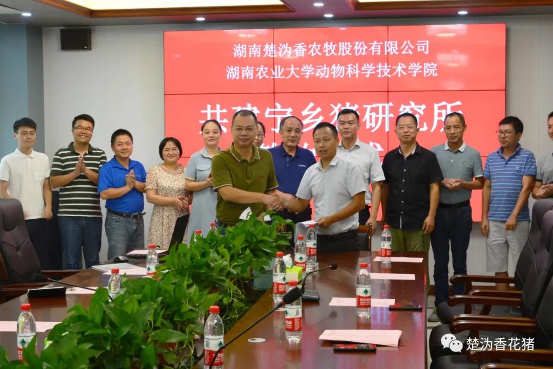 湖南楚沩香农牧股份有限公司和湖南农业大学动物科学技术学院共同成立的宁乡猪研究所于今日举行签约仪式。曾总在会上谈到,对于楚沩香公司来说,这是历史性的一天,我们将开启科技创新引领公司发展的新征程。科技创新是我们企业发展的源泉和动力,科技创新是第一生产力,我们共同成立研究所,在这个平台上,依托湖南农业大学动科院强大的科技创新力量,来解决宁乡猪产业发展中卡脖子的具体问题。