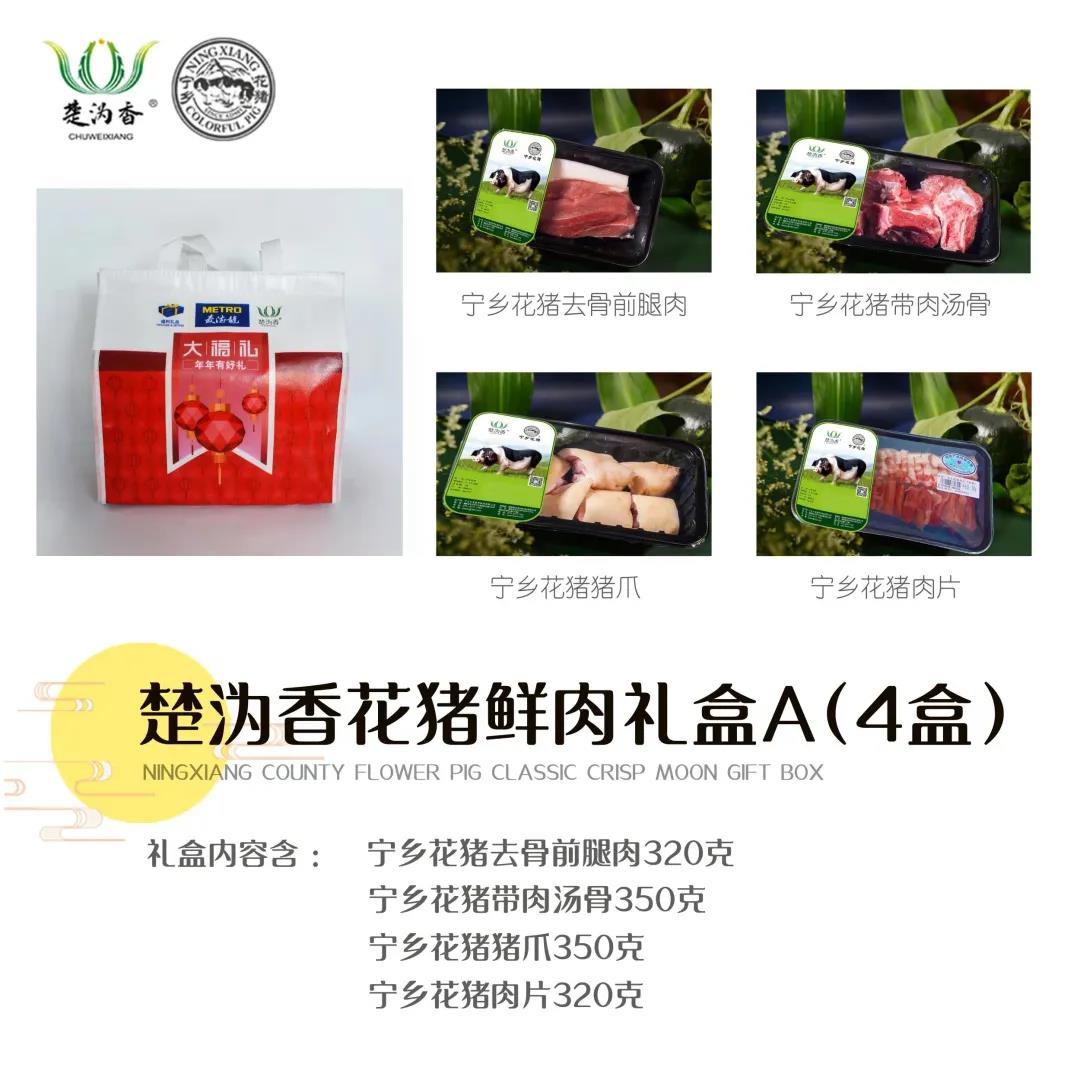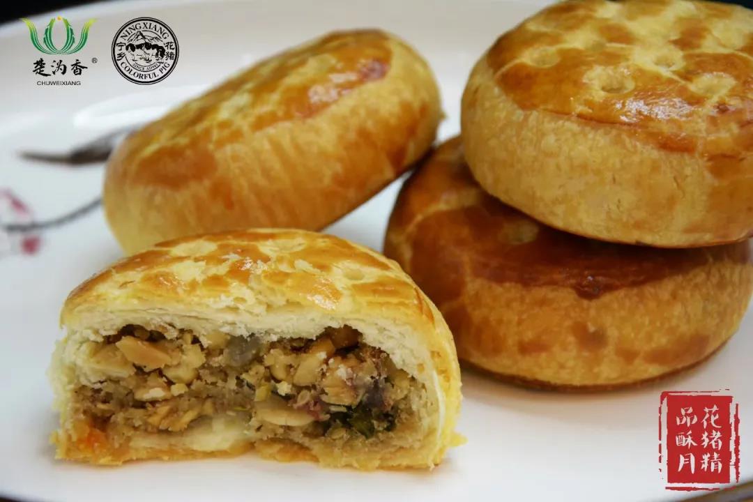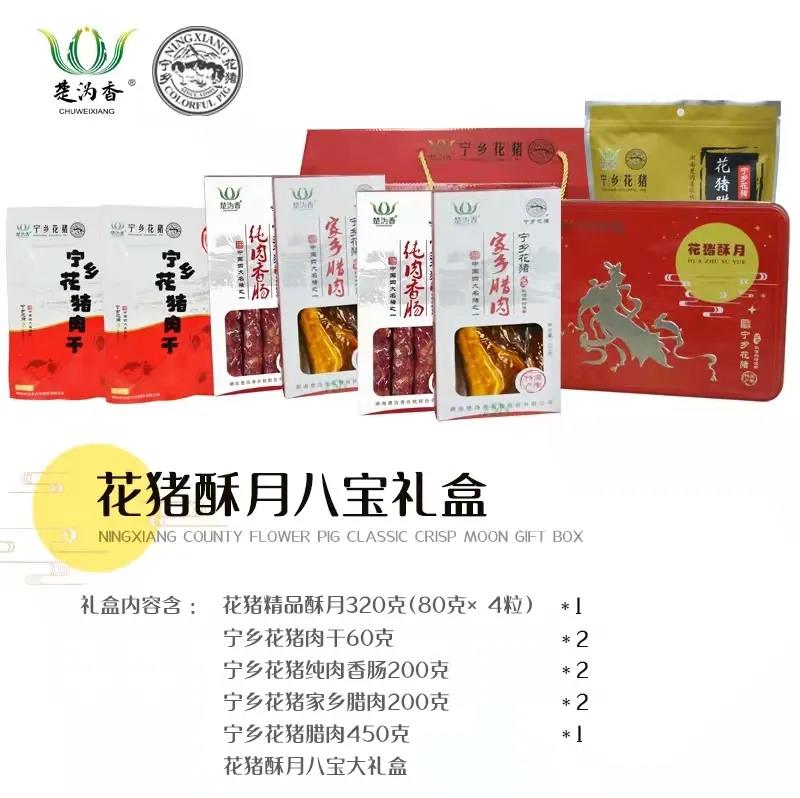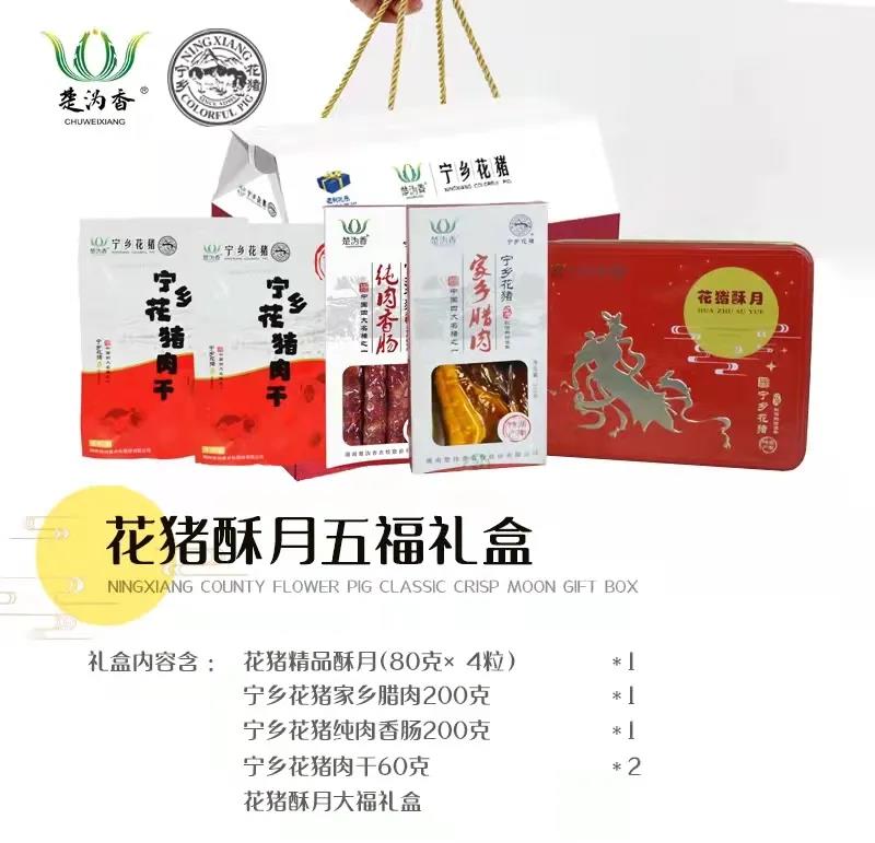 楚沩香花猪酥月遵循古法工艺,以宁乡花猪油和精选肥肉为馅料原料,料实材真,皮酥馅美,口齿留香。公司现有花猪酥月五福礼盒和花猪酥月八宝礼盒,礼盒中的花猪月饼搭配花猪香肠、花猪腊肉和小零食花猪肉干,是中秋节走亲访友的馈赠佳品。